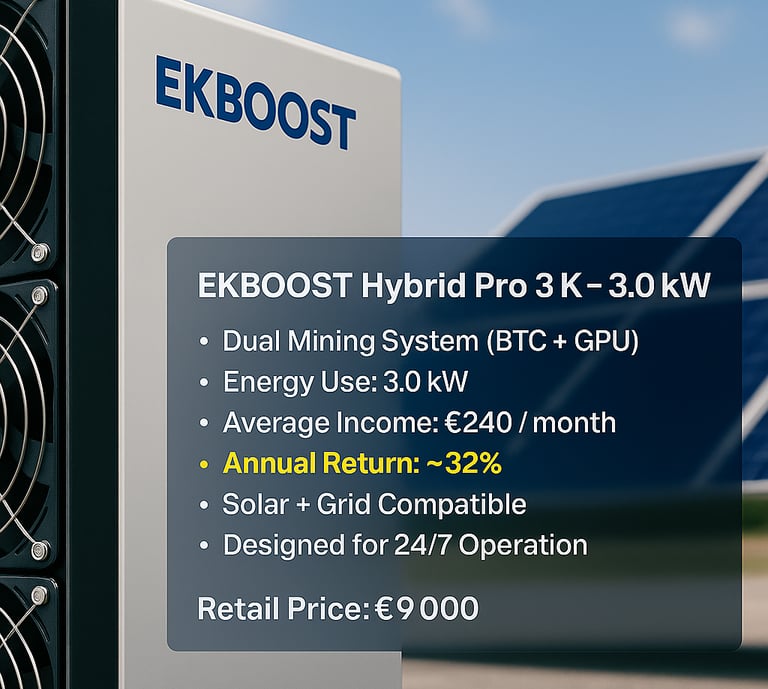 The Hybrid Pro 3K combines Bitcoin and GPU mining in one compact system, optimized for solar or hybrid power.
